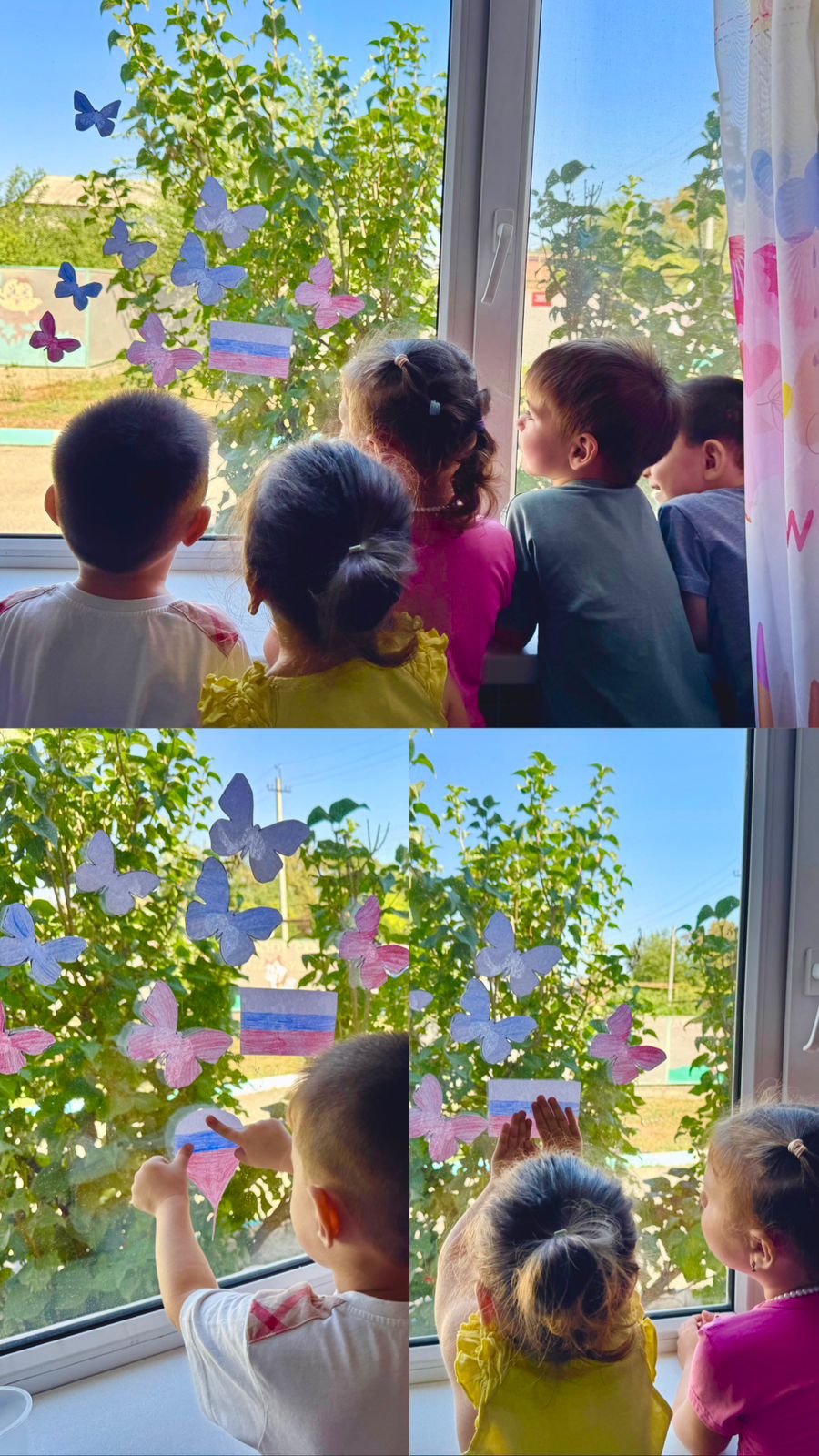 Дети раскрасили окна в группах рисунками, ассоциирующиеся с российским флагом.